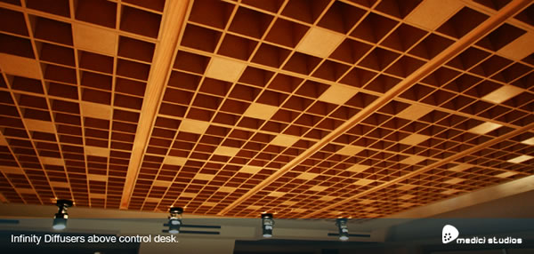 The studio was designed by renowned acoustic architect Peter Brown. Acoustic treatment includes absorbent cloth panelling throughout and Schroeder and Infinity Diffusers in the Control Room. A Log Diffuser is also situated in the main studio. The studio was purpose built from ground-up with a view to optimizing acoustics while at the same time providing a flexible and comfortable working environment. |
